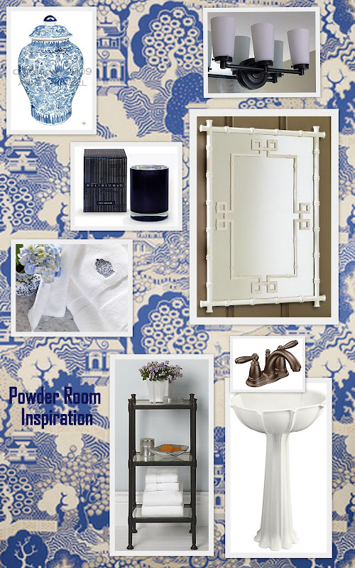 Last June I ran a poll on wallpaper options. And, while I still love both patterns (and agree with the majority's choice of the Banswara pattern), I decided to go a slightly different direction, primarily because I wanted the powder room to tie in with the adjacent family room and entryway. After much internal debate and hand-wringing, I've decided to go with a classic: Summer Palace by Osborne & Little (shown above). Not only is the print in my beloved blue and white, but it's in a classic chinoiserie pagoda pattern that will stand the test of time. And as for my fear of getting sick of it? Well, I had a nearly identical print (though in a more muted palette of cream and champagne) on the walls of my childhood bedroom. I figure if I still like the initial choice that I made at 16, then it should stand the test of time.